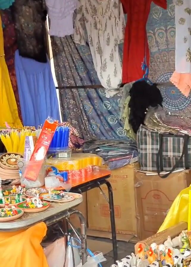 busy marketplace stall. The stall is filled with various items, including clothing, incense, candles, and figurines. A woman is seen standing behind the stall, arranging items. The stall is decorated with colorful fabrics and banners. The overall atmosphere is lively and bustling.