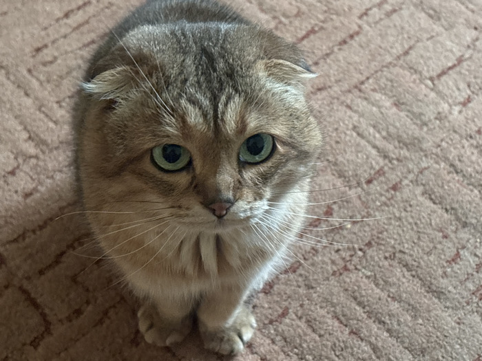 A gray and tan Scottish Fold cat with large, round, green eyes stares directly at the camera. Its ears are folded downward, characteristic of the breed. The cat is sitting on a patterned tan carpet with its paws close together. Its whiskers are long and white. The cat appears to have a slightly concerned or pleading expression.