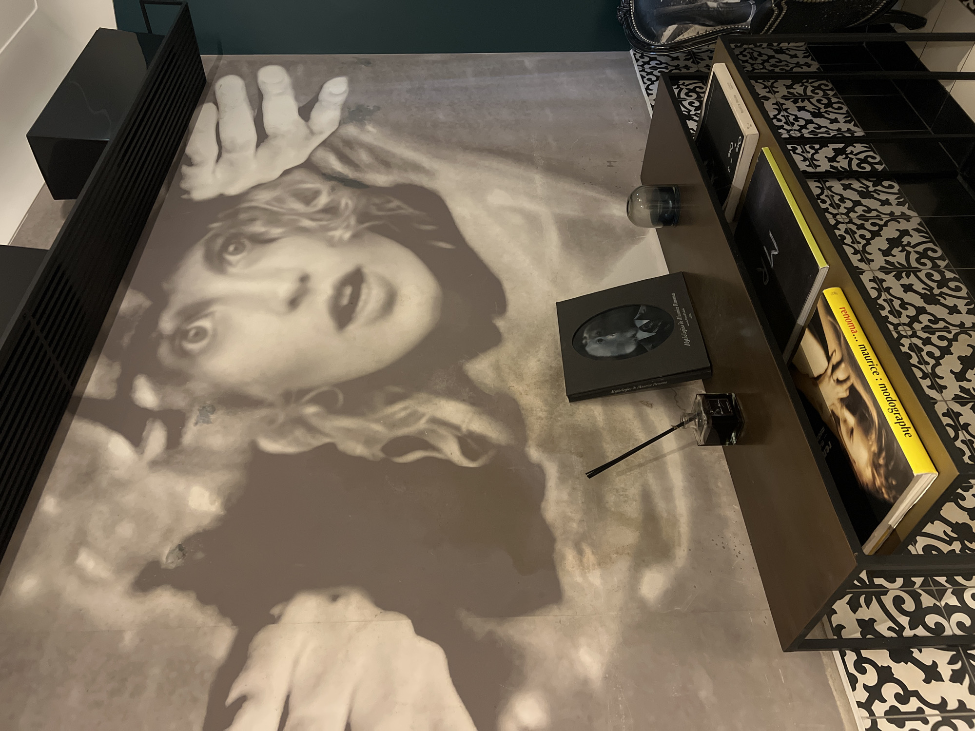 portion of a room with a large-scale black and white image of a woman's face printed on the floor. The subject appears to be looking upward with her mouth open and one hand raised near her head. To the left is a black, multi-tiered shelving unit. To the right is a dark brown and black shelving unit with several books on it. The books are in a vertical position and their spines are visible. The bottom shelf of this unit is covered with black and white patterned tiles. Between the shelving units, on the floor, are a small, clear glass globe, a black book titled "Mythologies de Maurice Reizman", and a small black inkwell with a quill. The location is Tel-Aviv, Israel.