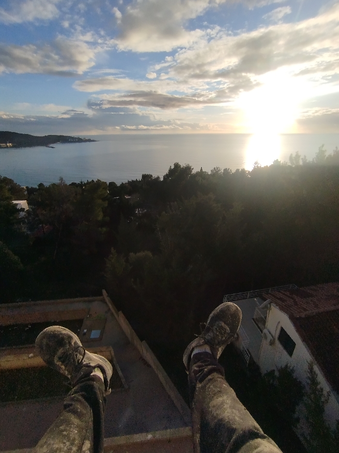 A high-angle shot shows a person's legs and feet dangling from a building or ledge. The footwear is dirty work boots. Below, dense trees lead to a coastline with the ocean and a partly cloudy sky meeting at the horizon. The sun is setting over the water, creating a bright glare. Some rooftops are visible amidst the trees. The overall scene evokes a sense of height and precariousness.
