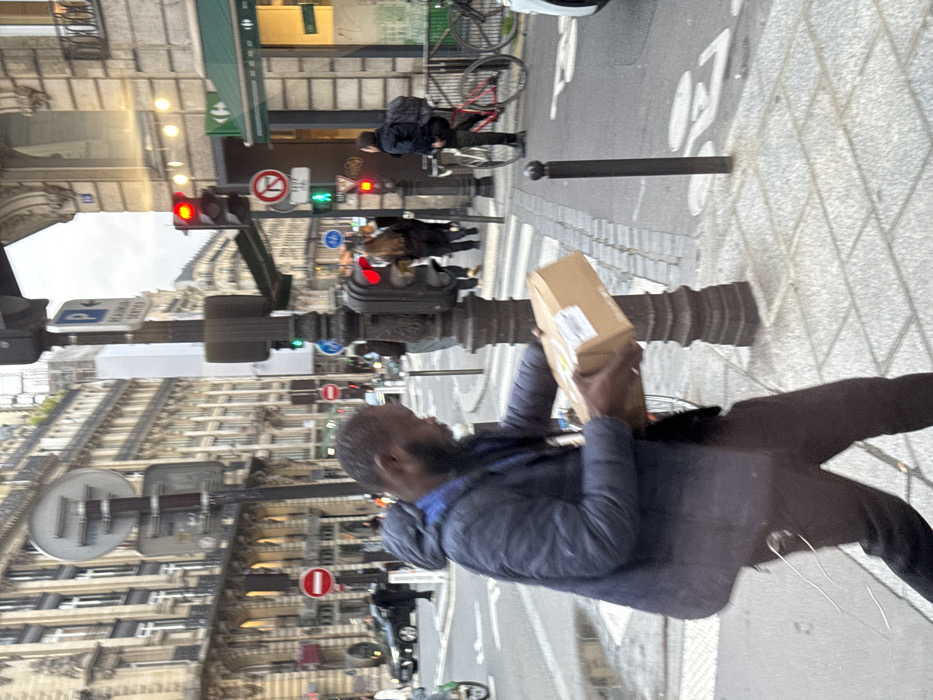 The image captures an urban street scene at dusk or night in Paris, France, specifically at the intersection of Rue Réaumur and Rue Saint-Martin/Boulevard de Sébastopol in the 3rd arrondissement. In the foreground and midground, a dark-skinned adult male with a short beard, wearing a dark blue hooded jacket and dark trousers, strides from right to left across a light-colored paved sidewalk. He holds a rectangular, light brown cardboard box with white labels in both hands, positioned in front of him. To his right, a dark multi-armed lamppost supports three traffic light arrays; two display red lights for vehicular traffic, and one shows a green pedestrian signal. A blue 'P' parking sign with directional arrows for 'BEAUMARCHAIS' (right) and 'SENTIER' (left) is affixed to this pole, along with a circular 'no left turn' sign. The street, marked with white bicycle lane symbols, runs horizontally in the background. A black bollard stands on the curb. The background features classic Haussmannian architecture, with tall, ornate stone buildings. The building on the right corner houses a 'Carrefour Express' supermarket, identified by its green signage and illuminated interior. Several pedestrians are visible on the sidewalks and at various points of the street. One individual in dark clothing is positioned next to a red bicycle parked on the right curb. A black sedan is stationary further down the street on the left. The sky is overcast and dimly lit.
