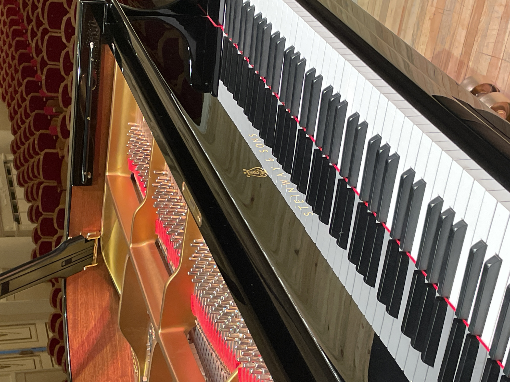 close-up, angled view of a black Steinway & Sons grand piano. The keys are prominently displayed, with the name "STEINWAY & SONS" visible on the piano's surface. The piano's interior, including the strings and tuning pins, is also visible. In the background, red theater seating is visible. The location appears to be a concert hall or theater in Yekaterinburg, Russia, based on the piano and seating.