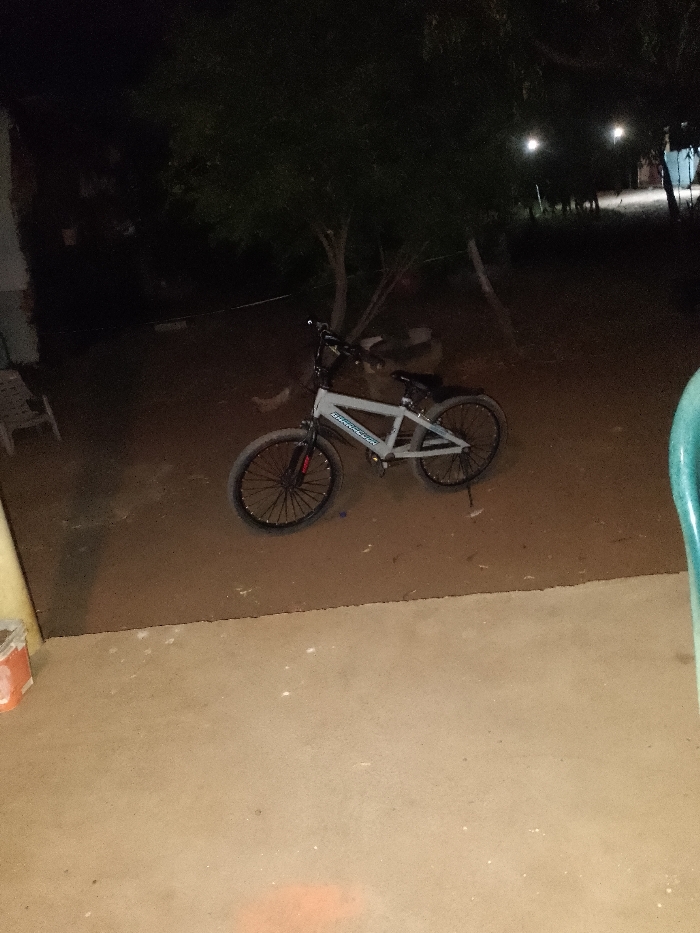 The image displays an outdoor night scene in Altagracia, Venezuela. A light grey BMX-style bicycle with black wheels is the central subject, positioned upright on a dirt surface. The brand "BARRACUDA" is visible on the bicycle's downtube. Behind the bicycle, several small trees or shrubs are present. To the left, a partial view of a white plastic chair is visible on the dirt. To the right, a segment of a light blue object, possibly a chair or architectural element, intrudes into the frame. The immediate foreground consists of a light-colored concrete or paved surface. In the background, two artificial light sources illuminate a dark environment, revealing faint outlines of distant structures, one appearing light blue. No individuals, actions, or interactions are discernible.