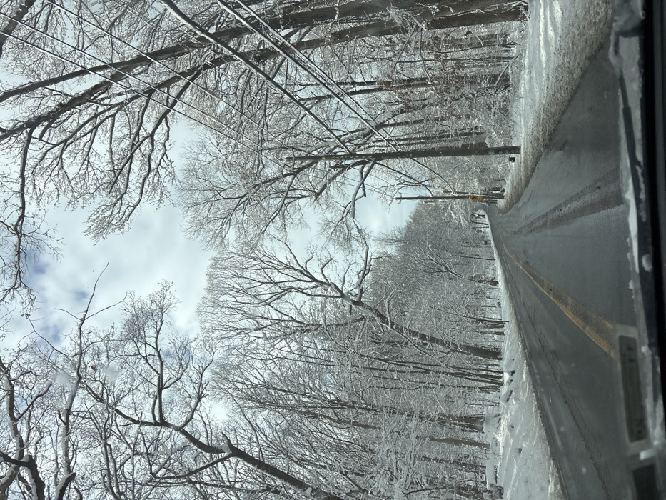 A road with yellow lines runs through a snowy forest. The trees are bare, their branches coated in white. Power lines stretch above. The sky is visible through the trees, appearing cloudy and overcast. The view is framed by a portion of a vehicle's interior, suggesting the photo was taken from inside a car. The scene is serene and wintry.