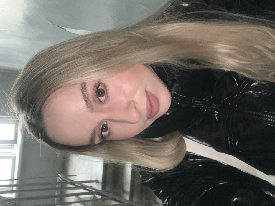 A young adult female is depicted in a close-up selfie within an unrenovated indoor stairwell, characteristic of residential or public buildings found in cities such as Minsk, Belarus