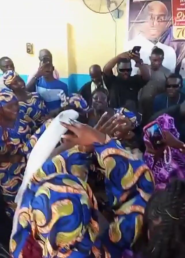A wedding reception is in full swing indoors. A bride in a white gown and veil dances with women in matching blue and gold patterned outfits, some with matching headwraps. One woman wears a purple outfit and headwrap. Many attendees record the event on their cellphones. A man in a suit is visible in the background, and a poster with a picture of a man is on the wall. A ceiling fan is rotating above the crowd, and there's a blue cross on the wall.