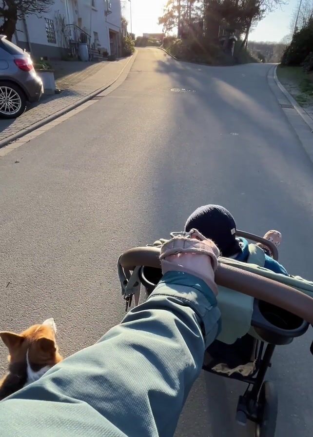 person pushing a stroller down a paved road. A baby wearing a dark-colored hat is in the stroller. The sun is shining brightly in the distance, creating a glare. A Corgi dog on a leash walks alongside the person. The person wears a green jacket. A house and parked car are visible on the left side of the road. A grassy area is on the right side of the road. The dog is licking the leash. The camera perspective is from the person pushing the stroller.