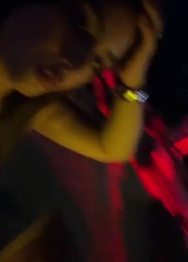 A young woman is recording a selfie video, moving the camera to show a nightclub in the background. The club has blue and red lights, and the woman is wearing a necklace. She is wearing dark eyeliner, and has her dark hair down. The lighting is dim.