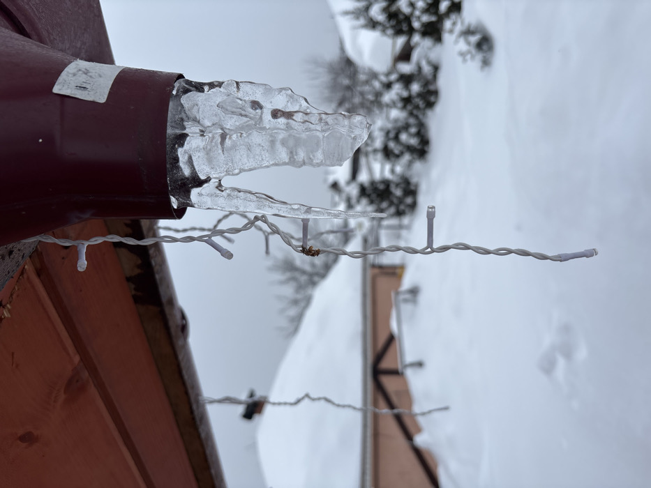 This image depicts an outdoor winter scene in Chaikovsky, Russia, characterized by heavy snow and ice. In the immediate foreground, a large, translucent icicle extends downward from the opening of a reddish-brown metal downspout, which is affixed beneath a reddish-brown wooden eave. A white string of LED lights, partially tangled with some brown organic debris, hangs vertically near the downspout and icicle. The ground below is entirely covered by a thick layer of pristine white snow. In the midground, to the left, a building with a reddish-pink lower facade and a heavily snow-covered roof, featuring a dark chimney, is visible. Several snow-laden evergreen trees are scattered across the midground and background. The sky is uniformly overcast and grey, indicating a winter day. No individuals or active subjects are present in the scene.