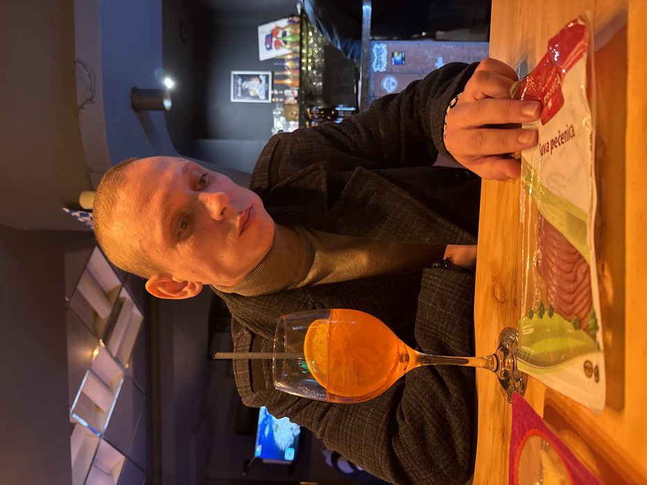 An adult male is seated at a wooden bar counter in a dimly lit establishment identified as a bar or casual restaurant in Budva, Montenegro. He is positioned in the foreground, wearing a dark, patterned coat over a light-colored turtleneck sweater. His right hand rests on a sealed clear plastic package containing sliced cured meat, labeled "suva pečenica". To his left, a wine glass holds an orange-colored beverage, garnished with an orange slice and a dark straw. The man's gaze is directed slightly downwards and to his right, with his mouth slightly ajar. In the background, behind the man, a bar area is visible, featuring shelves stocked with various liquor bottles, a framed poster (partially displaying "Aperol"), and a downlight. A television screen displaying a luminous, blurry image is situated on the far left of the background. Reflective ceiling panels and additional lighting fixtures are visible above. A blue and white checkered flag or banner hangs from the ceiling. A portion of another individual's arm and shoulder is faintly visible behind the bar counter on the right.