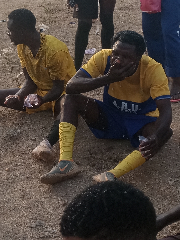 The image captures a ground-level view of several individuals on a dry, reddish-brown dirt surface in Akwanga, Nigeria. In the middle ground, two dark-skinned males are seated. The male on the left wears a wrinkled yellow short-sleeved shirt and yellow shorts over dark leggings, holding a clear plastic bag containing ice cubes in his left hand. His feet are covered in light-colored wraps. He gazes to his left. The male on the right wears a yellow and blue short-sleeved shirt with "A.B.U. adia" printed on the blue section, and blue shorts over dark leggings with yellow soccer socks and mud-stained grey-green athletic shoes. Water droplets are present on his face, chest, and right leg. He holds a clear plastic bag with ice or liquid in his right hand and covers his mouth and chin with his left hand. In the background, the lower portions of two additional individuals are partially visible: one in dark attire behind the left seated male, and another in blue pants and light flip-flops near a pink object behind the right seated male. The immediate foreground shows the top of a dark, curly-haired head with visible water droplets. The ground is sparse with small pebbles and dried debris.