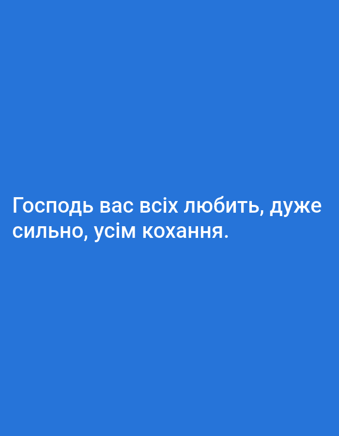The image displays white Cyrillic text on a solid, uniform blue background. The text, centered on the screen, reads: "Господь вас всіх любить, дуже сильно, усім кохання." This translates to "The Lord loves you all, very much, with all love." The image contains no visual elements such as people, objects, or environmental details that would allow for the identification of a specific location within the city of Kharkiv, Ukraine, or any other geographical area. There are no discernible actions or interactions depicted.