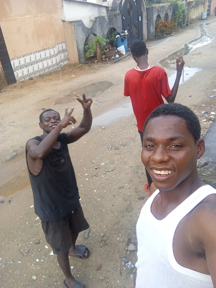 Three males are present on an unpaved road in Lekki, Nigeria, characterized by dirt, gravel, and standing water puddles. The male in the immediate foreground, wearing a white sleeveless undershirt, captures a selfie, smiling directly into the camera. To his left, another male, wearing a black sleeveless shirt and dark shorts with sandals, smiles at the camera while making a "peace sign" gesture with both hands raised. Behind and to the right of the foreground subject, a third male faces away from the camera, wearing a red short-sleeved t-shirt with white trim and dark footwear; his left arm is slightly raised. In the background, a light brown building with patterned tiles on its lower facade is visible to the left. A grey concrete fence with decorative elements and an ornate dark metal gate stand further back on the right, beyond which some green foliage is present. The scene depicts an informal outdoor setting under daylight conditions.