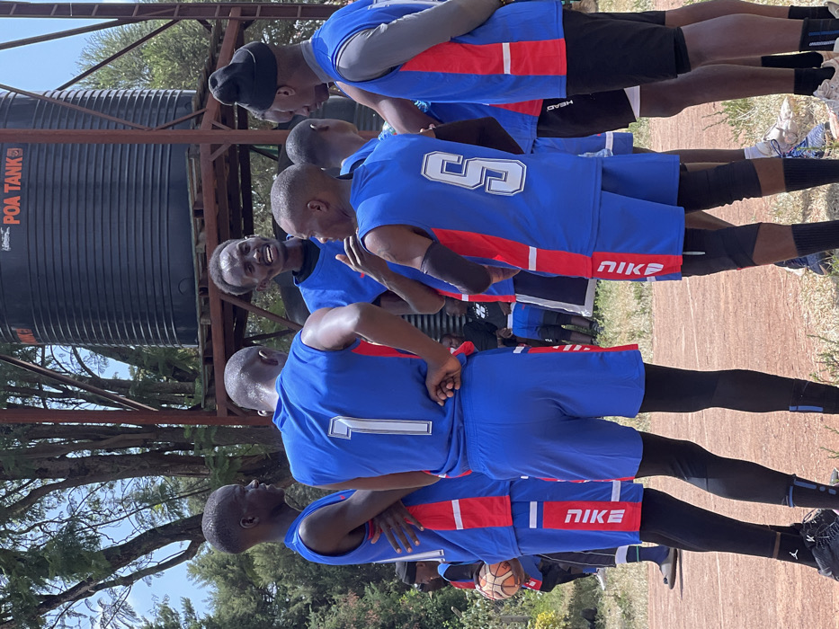 An outdoor scene in Nyeri, Kenya, depicts a huddle of approximately seven to eight young adult males gathered on an unpaved court or field. Most individuals are dressed in matching blue sleeveless athletic jerseys with red side panels and blue shorts, often worn over black compression shirts or pants. One male on the far left holds an orange-brown basketball. The central figure, viewed from the back, wears a blue jersey with a prominent white number "1" and has his hands on his hips. Another individual, also seen from the back, wears jersey number "S" (or 5) and has a black arm sleeve on his left arm, appearing to gesture towards the group. A third man, visible between others, smiles while looking towards the huddle. In the background, a large, black, cylindrical "POA TANK" is elevated on a metal or wooden support structure, with green trees and a bright sky visible. The ground is dry and appears to be dirt or gravel.