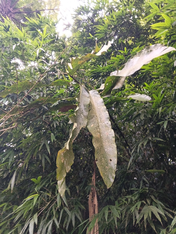 A vertical, upward-angled shot captures a dense arboreal environment at Bangalum Bridge, Papua New Guinea. The foreground is dominated by a cluster of large, elongated, dark green leaves, exhibiting visible surface dust or residue and minor structural imperfections. These leaves are partially obscured by and intertwined with thinner branches originating from the left. Behind the foreground foliage, a dense canopy of vibrant green, narrow, pointed leaves, consistent with bamboo or similar vegetation, fills the frame. Diffused bright light, presumably from the sky, penetrates the upper portion of the canopy. No human subjects, animals, or artificial objects are present. The scene depicts a natural, undisturbed tropical forest setting.