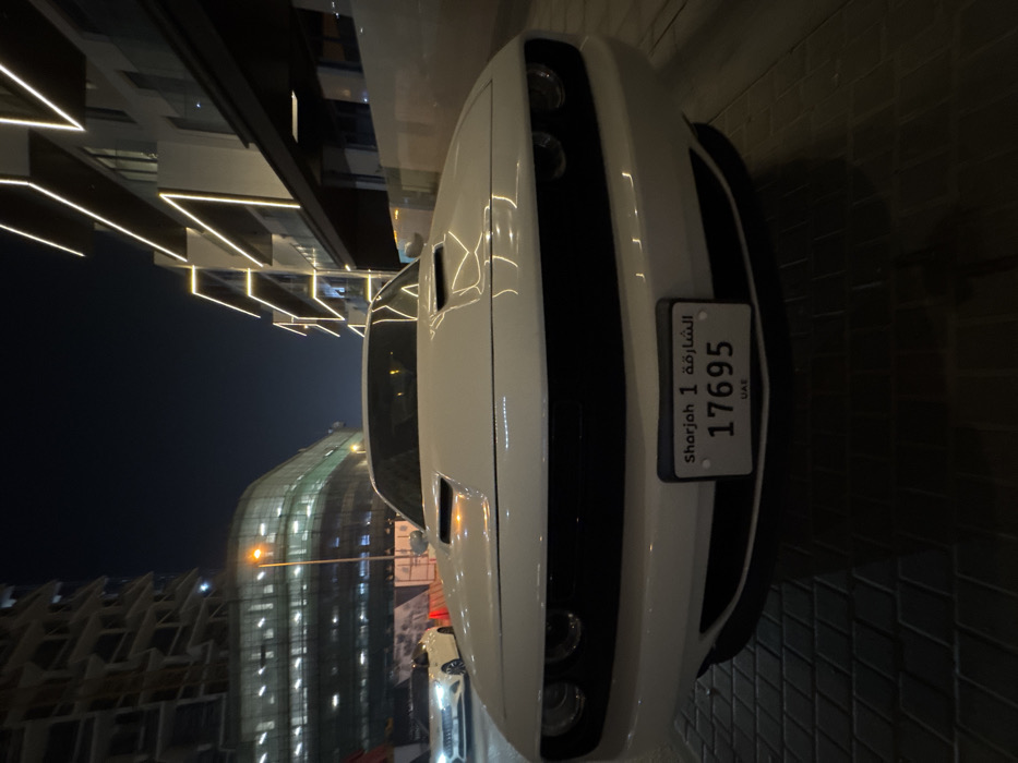 A white Dodge Challenger's front is featured, showcasing its headlights, grille, and hood. The license plate, reading "Sharjah 1 17695 UAE," is prominently displayed. The car is parked near modern buildings with illuminated architectural details, suggesting an urban setting at night. The perspective is slightly angled, emphasizing the vehicle's design and position within its surroundings.