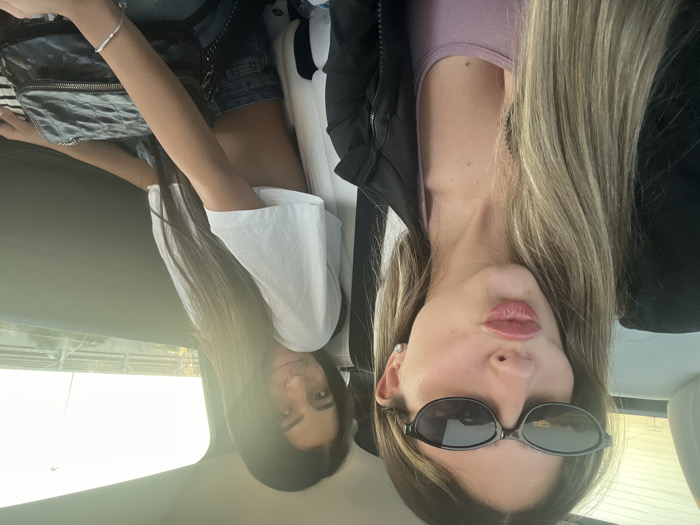 Two adult females are observed in the rear passenger compartment of a vehicle during daylight hours with strong sun illumination