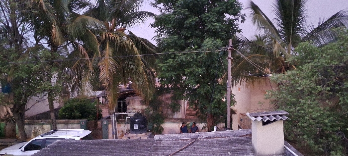 residential area in Peddiveedu, India. The scene is taken from a rooftop looking down onto a street. The street is lined with trees, including palm trees, mango trees, and other deciduous trees. There are two men standing in a yard, possibly talking. A white car is parked in the street. The houses are built of concrete and have tile roofs. There are power lines running along the street. The image is taken from an angle that provides a good view of the street and the surrounding buildings. A building with a tile roof is in the foreground, extending out to the right edge of the image.