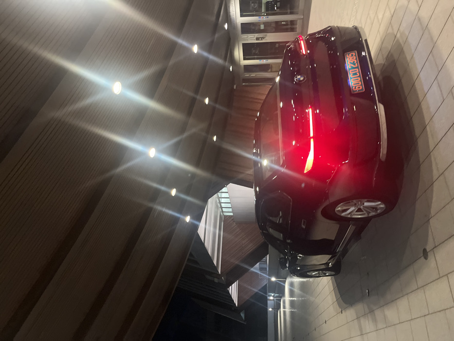 The image depicts a nighttime scene under a modern architectural canopy, identified as part of a Council of Europe facility in Strasbourg, France, based on the diplomatic license plate. A dark-colored BMW luxury sedan is positioned with its rear facing the viewer, slightly angled towards the right. Its red taillights are illuminated. The rear passenger door on the driver's side of the vehicle is partially open. A diplomatic license plate, "600 CD 2385," featuring white or silver characters on a red background, is affixed to the rear bumper. The overhead structure is characterized by a wooden-slatted, angular ceiling illuminated by multiple recessed circular spotlights. The ground is paved with light-colored, square or rectangular tiles. In the background, glass entrance doors of the building are visible, reflecting interior lights, alongside further angular wooden architectural elements. No individuals are visible.