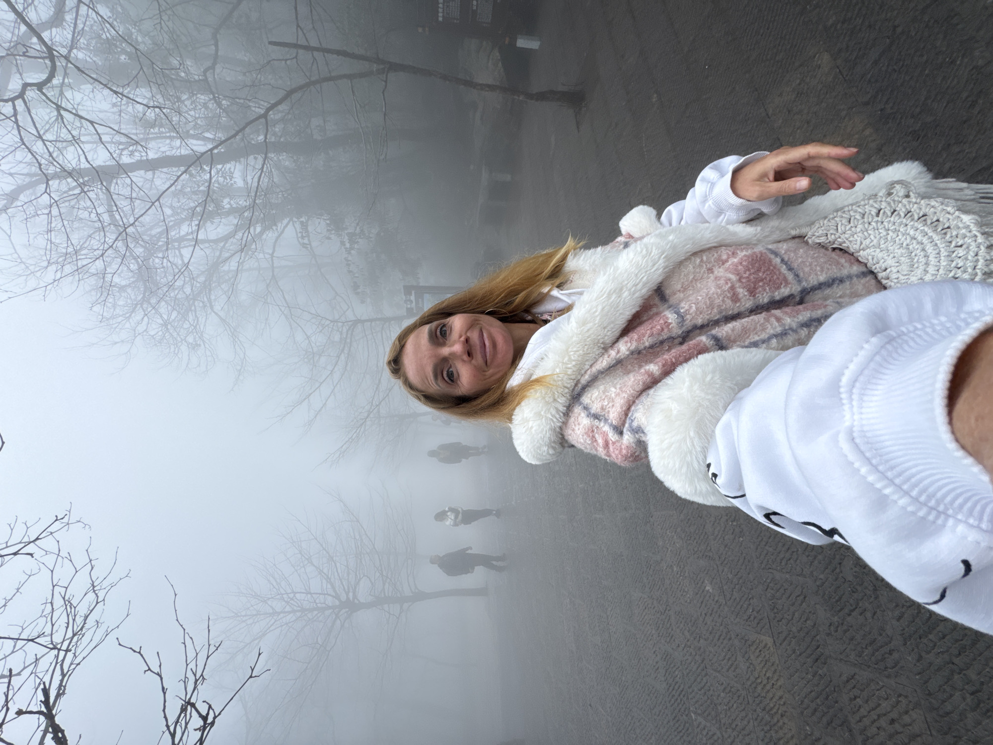 A female individual, approximately 40-50 years old, with long light-brown hair and a slight smile, is depicted in a first-person perspective shot on a paved pathway within a fog-laden natural area in Yongding District, China. She is positioned on the right half of the frame, looking directly at the camera. She wears a white hooded sweatshirt, a pink and white plaid faux fur coat with white trim, and gold hoop earrings. A light-colored, possibly crocheted, shoulder bag is slung over her shoulder. The hand of a person holding the camera, clad in a white long-sleeved garment with black markings, is visible in the lower-left foreground, creating a "follow me" interaction with the main subject. The environment is characterized by dense, white fog that severely restricts visibility. The ground is a dark, patterned paved surface. Bare-branched deciduous trees, their forms softened by the mist, line both sides of the path. In the mid-ground, three to four indistinct adult figures are walking away from the camera's perspective along the same path. On the right side of the path, partially obscured signs with Chinese characters are visible, along with what appears to be a stone bench.