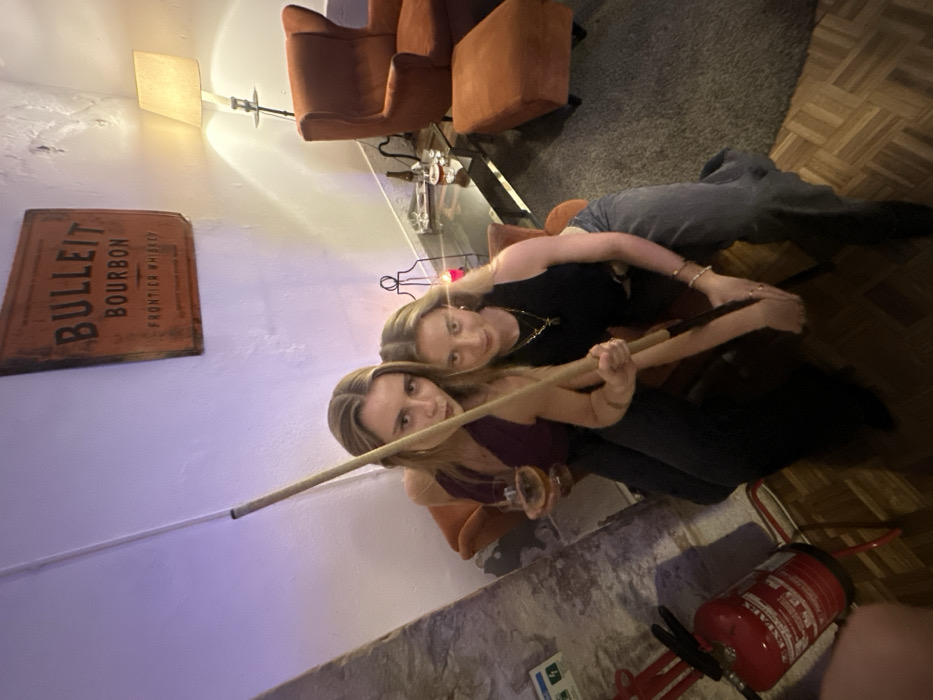 Two young adult women are positioned centrally within an indoor establishment in Lisbon, Portugal, indicated by an "ENFASIL" brand fire extinguisher. The woman on the left, wearing a purple halter top and dark pants, holds a glass containing an amber liquid in her left hand and grasps a pool cue with her right hand, maintaining direct eye contact with the camera. The woman on the right, dressed in a black tank top and dark grey pants, also faces the camera, holding the same pool cue with both hands in front of her body. The background features a white, textured wall displaying a rectangular, aged-looking metal sign for "Bulleit Bourbon Frontier Whiskey." To the right, an orange upholstered armchair with a matching ottoman rests on a dark grey rug. A floor lamp with a beige shade stands next to the armchair, providing illumination. A glass-topped coffee table is situated between the women and the seating area, holding a brown bottle, several clear glasses, and a decorative black wire candelabra with a lit red candle. In the lower-left foreground, a red ENFASIL fire extinguisher is mounted next to a concrete-textured wall pillar, beneath which is a white sign with blue emergency pictograms. The flooring consists of a light-brown parquet pattern. The overall lighting is dim, with a noticeable purple ambient glow on the left wall.