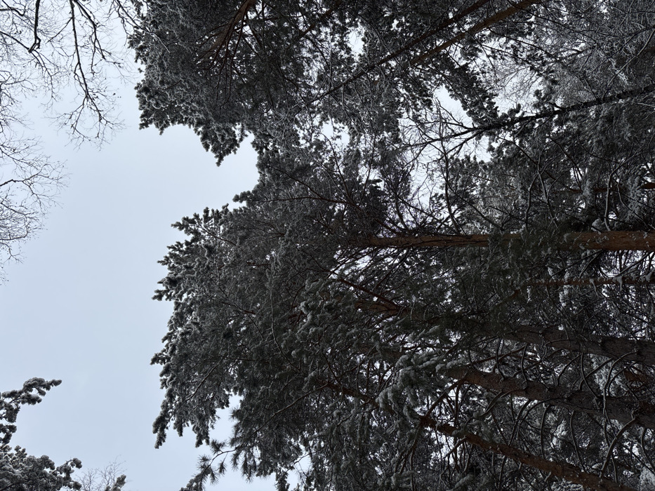 - "Looking up through a forest canopy, the scene depicts tall pine trees covered in frost or light snow against a pale, overcast sky" by FM-FRFuw2, licensed under CC BY 4.0