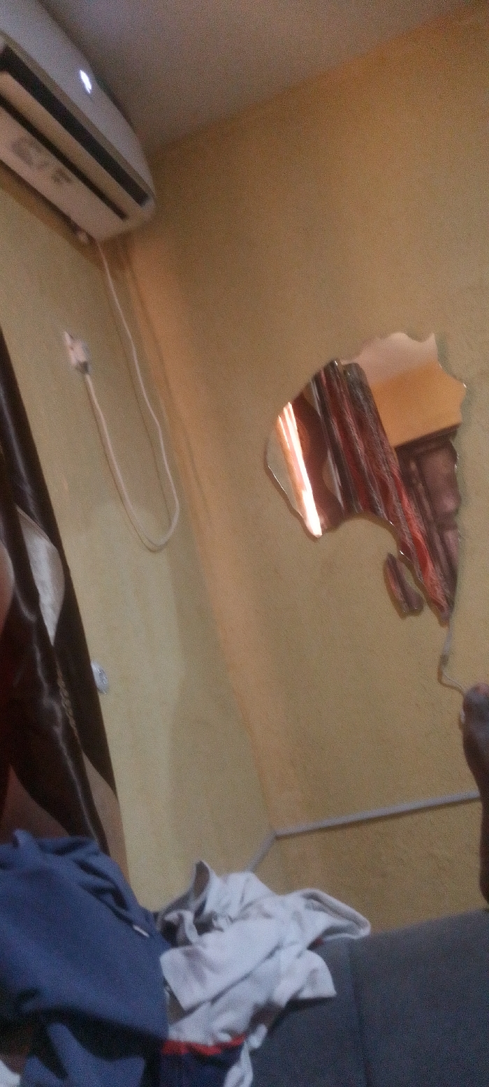 room with a beige wall, a white air conditioner mounted on the ceiling, and a partially broken mirror on the wall. The mirror is reflecting the ceiling and an area with red curtains. A brown fabric covers a portion of the lower left side of the image and a dark blue shirt and a white shirt lie on a gray surface in the lower right side of the image. The floor is not visible in the image. The room is dimly lit and there is no one present. The coordinates (latitude: 8.829, longitude: 7.585) do not correspond to a location in the city of Karshi, Nigeria. It is likely that the image was taken elsewhere.