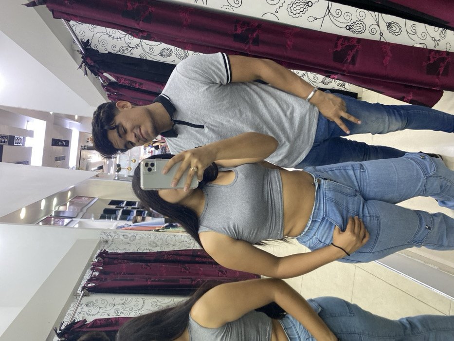 A couple stands in front of a mirror taking a selfie. The woman, partially obscured by the phone, wears a gray crop top and light blue jeans with cargo pockets. The man behind her wears a gray polo shirt and dark blue jeans, making a peace sign with his hand. They appear to be in a store, with clothing racks visible in the background and the reflection in the mirror. The lighting is bright, and the image is taken at a slightly skewed angle.