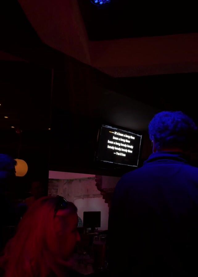 group of people gathered in a dimly lit karaoke bar. A television screen displays song lyrics, and a disco light cycles through blue, green, and red. A woman with red hair is sitting in the foreground, while a man with blue hair stands in the background. There are other individuals partially visible in the scene, some holding drinks. The bar has a modern feel, with reflective surfaces and exposed brick.