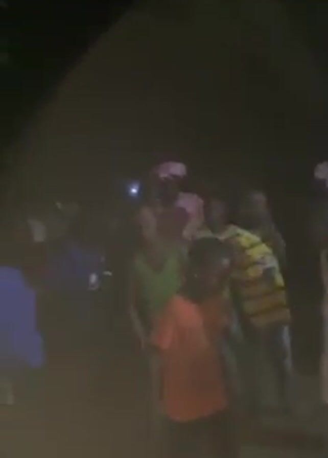A group of children dance outdoors in the dark, with only one light source illuminating them. Some wear brightly colored clothes, including orange, yellow stripes, pink, blue, and white. The recording quality is poor. The location appears to be an open outdoor area.