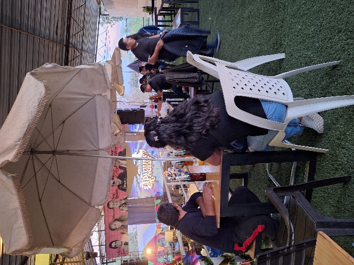 group of people sitting at tables outside a restaurant in Socabaya, Peru, located at coordinates -16.459 latitude and -71.545 longitude. There are three men and two women sitting at tables under a white umbrella. One man is sitting at a table by himself, wearing a black shirt and black pants. He is looking at a screen in the distance. Another man is sitting with a woman at a table. He is wearing a black shirt and jeans and she is wearing a black shirt and blue jeans. The man is looking at the woman and the woman is looking down at a table. The third man is sitting at a table by himself and wearing a dark shirt and black pants. There are various bottles of beer on the table. The ground is covered in green artificial grass. In the distance, there is a large screen, likely showing advertisements or entertainment. The setting is an outdoor dining area with an umbrella providing shade and artificial turf covering the ground. The ambiance appears relaxed and casual.