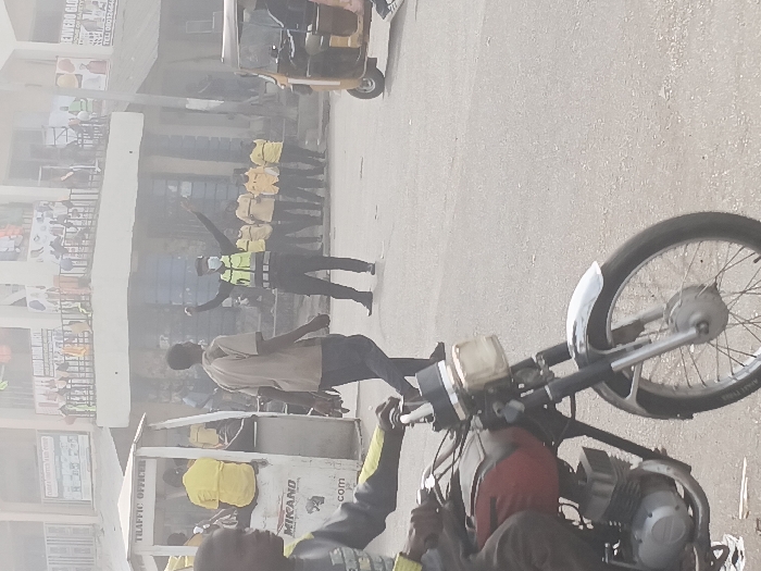 An urban street scene unfolds under hazy daylight conditions. In the foreground left, a person operates a red and black motorcycle with a silver front fender and a rectangular headlight, displaying "ANAT TIRES" on its front tire. The rider wears a grey long-sleeved shirt with a yellow stripe on the right arm. In the midground, a male pedestrian in a light brown short-sleeved shirt and dark trousers walks across the paved asphalt road from left to right. Centrally positioned in the road, a male traffic officer, wearing a dark uniform, a bright yellow-green reflective vest, and a dark face mask, directs traffic with both arms raised and palms open. To the right, a yellow three-wheeled auto-rickshaw (tuk-tuk) is partially visible, facing right, with a driver inside. In the background, to the left, a small white booth labeled "TRAFFIC OFFICE" and "MIKANO" hosts several individuals in yellow short-sleeved shirts; one person sits on the booth's roof. To the right, a group of approximately five to six individuals, also dressed in matching yellow short-sleeved shirts and dark trousers, stands in a line by the roadside, facing the traffic officer. The far background features a multi-story building with balconies, from which clothes hang, and visible signage, including "ENVRO GLOBAL POWER SUPPLY" and a phone number (0803244646). The entire scene is characterized by a pervasive atmospheric haze.