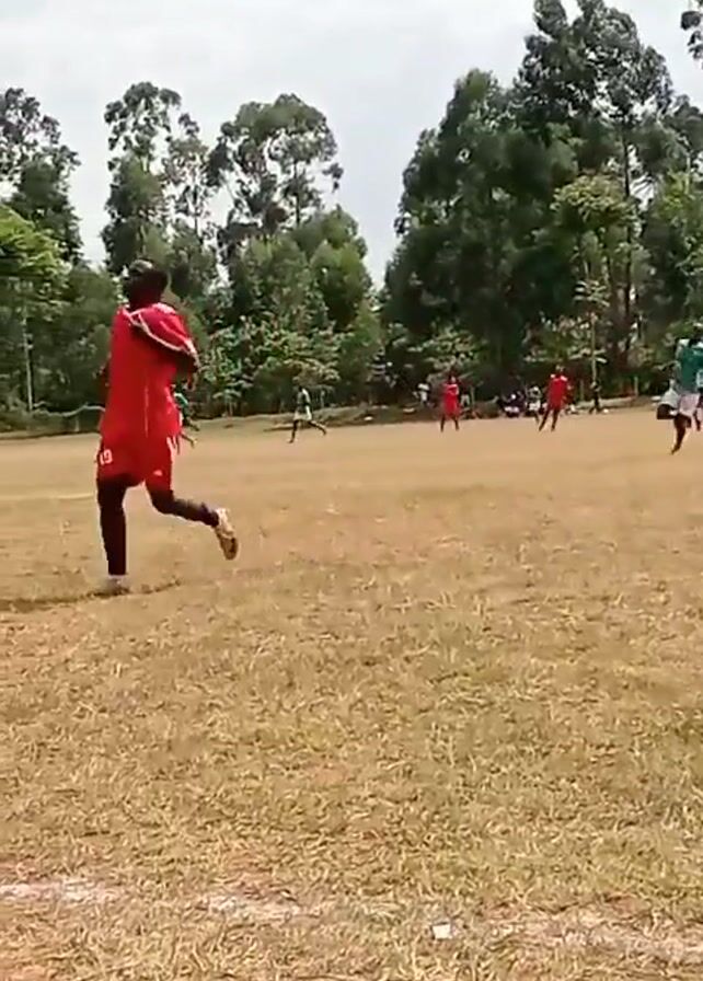 soccer field during a game. There are several players wearing red and green uniforms. The player wearing red, with number 19 on the back, is in the foreground running toward the camera. The field is mostly dry grass. Trees surround the field in the background. The sky is partially cloudy.
