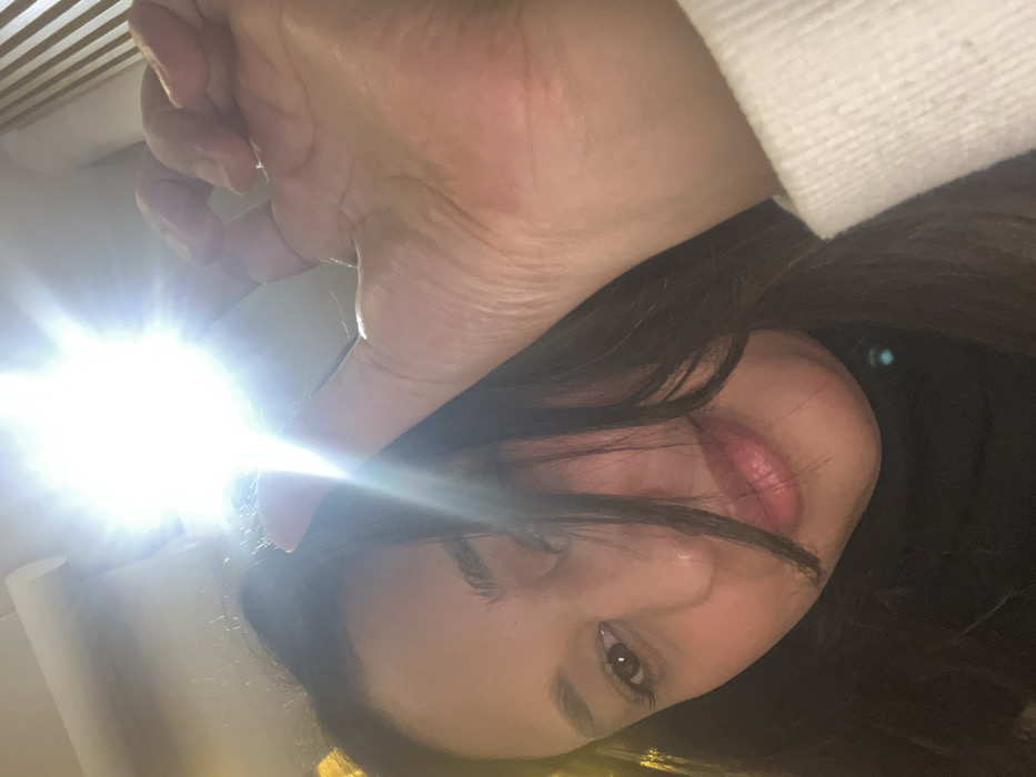 A female individual is depicted in a close-up, indoor shot. Her face, characterized by dark hair falling across the forehead, dark eyes (the right eye is clearly visible), and pink-tinted lips, is positioned in the lower-left quadrant, with her gaze directed towards the viewer. She is wearing a dark, high-neck garment, likely a turtleneck. A light-toned hand, presumably hers, is visible in the upper-right, with fingers partially flexed, positioned to partially obscure a brilliant, star-shaped light source that dominates the upper-center of the frame. A white, ribbed sleeve is visible on the far right. The intense light source renders the background largely indistinguishable, though faint hints of light-colored walls or fixtures are present. The precise location within the city of Meknes, Morocco, cannot be determined from the visual evidence presented.