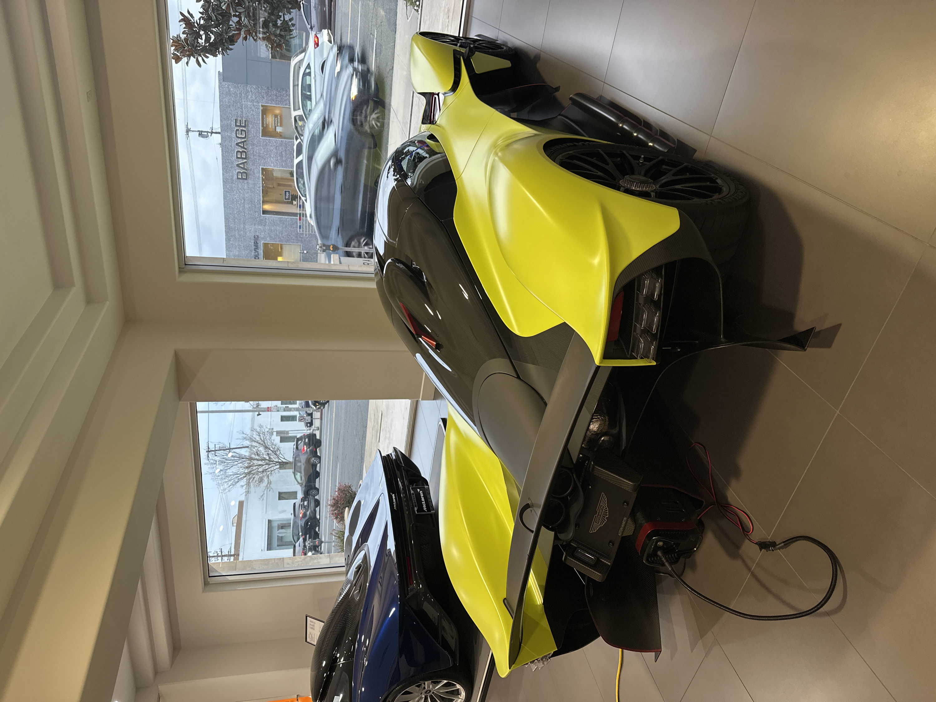 A vibrant yellow and black Aston Martin Valkyrie stands within a dealership. The car's rear is in view, with its prominent wing and exhaust system. Adjacent to it, a blue McLaren is partially visible. Outside, buildings are reflected in the dealership's windows, including one labeled "Babbage". Cables and equipment are visible near the Aston Martin, suggesting it might be undergoing maintenance or preparation. The scene is brightly lit, highlighting the vehicles' colors.