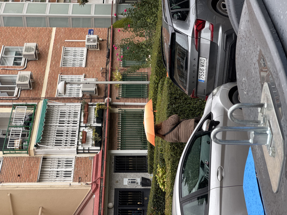 The image depicts an urban residential street scene in Madrid, Spain, under overcast conditions. In the immediate foreground, a dark, wet street fixture with two metallic U-shaped attachments is partially visible. The midground contains two parked vehicles: a silver hatchback (front section visible) and a gray Skoda Kamiq SUV, bearing Spanish license plate 7556 MXD (rear section visible). An adult individual, observed from behind, walks between the parked cars and a green, trimmed hedge. They are holding an open orange umbrella and are dressed in a brown quilted jacket with a dark shoulder bag. Behind the hedge, rose bushes displaying pink flowers are evident. The background consists of multi-story red brick residential buildings. These structures feature multiple windows equipped with white accordion-style security grilles, balconies (one with planter boxes), and external air conditioning units. A street light pole is centrally positioned, and a blue street sign is affixed to a building wall. A modern building with a vertical glass enclosure is partially visible on the far right.
