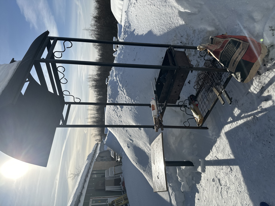 The image depicts an outdoor winter scene in Pokrov, Russia, under a bright sun and a clear blue sky with faint contrails. A black, multi-tiered metal brazier with a curved canopy stands in the center-right foreground. Its upper shelf displays several metal skewers and a white plastic bottle. The lower shelf holds a white rectangular food item, a green vegetable stalk, and two wire grilling grates. A partially opened, striped bag containing charcoal rests on the snow near the brazier's base. To the left, a small, dark-colored square table is partially embedded in the deep snow. The entire ground is covered in white, undulating snow, forming significant mounds extending into the mid-ground. In the left background, a light-colored, single-story building with a snow-covered roof is visible, featuring a door, windows, several stacked white objects, and a ladder leaning against it. A dense line of bare trees forms the distant horizon. No individuals are present.