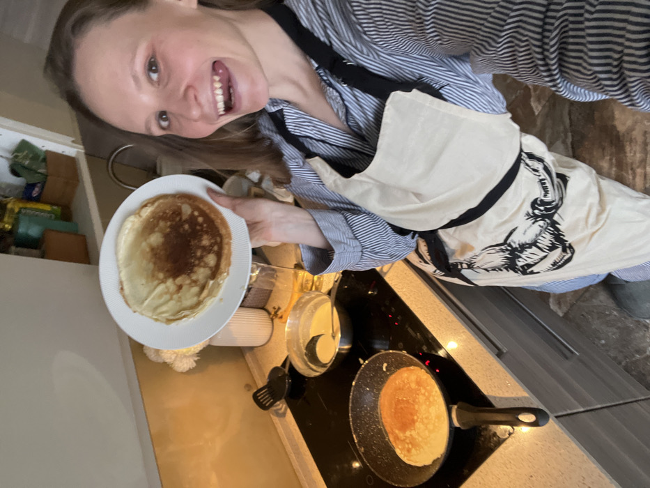 The scene depicts an adult female in a domestic kitchen setting in the city of Khimki, Russia. The female, with light skin and brown hair, wears a blue and white striped long-sleeved shirt and a light-colored apron featuring a black graphic design, possibly depicting a mythological horned creature. She is smiling broadly with her mouth open and tongue slightly extended, looking directly towards the camera. She holds a white fluted-edge plate with her left hand, presenting a cooked, lightly browned pancake or blini. To her left, on a black induction or ceramic cooktop, a dark non-stick frying pan contains a pancake that is actively cooking, exhibiting a golden-brown surface. Adjacent to the frying pan, a metallic bowl holds light-yellow batter with a ladle resting inside it. Behind the batter bowl, a clear glass bottle containing yellow liquid (likely cooking oil) is visible. A black slotted spatula leans against the light-colored backsplash. A white fluted decorative vase containing white artificial flowers is situated on the counter to the left of the batter bowl. Overhead shelves or cabinets in the background are out of focus but show various containers. The lower kitchen cabinetry consists of light gray or beige units with horizontal handles. The overall environment suggests a clean and modern kitchen.