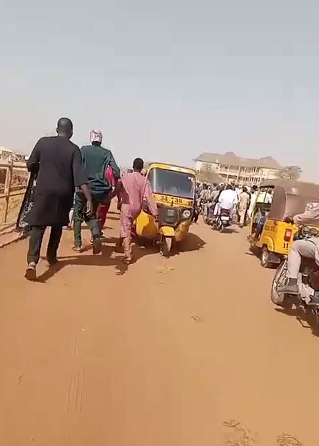 The video depicts a scene in a dusty, outdoor location with a crowd of people, many of whom are walking or riding motorcycles and yellow auto-rickshaws. Most people are dressed in traditional clothing. The ground is a reddish-brown color, likely due to the type of soil. The vehicles appear to be navigating through the crowd. A building is visible in the background. There is a clear sky overhead.