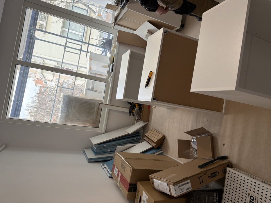 The image displays an interior room, located in Burgas, Bulgaria, in a state of renovation or furniture assembly