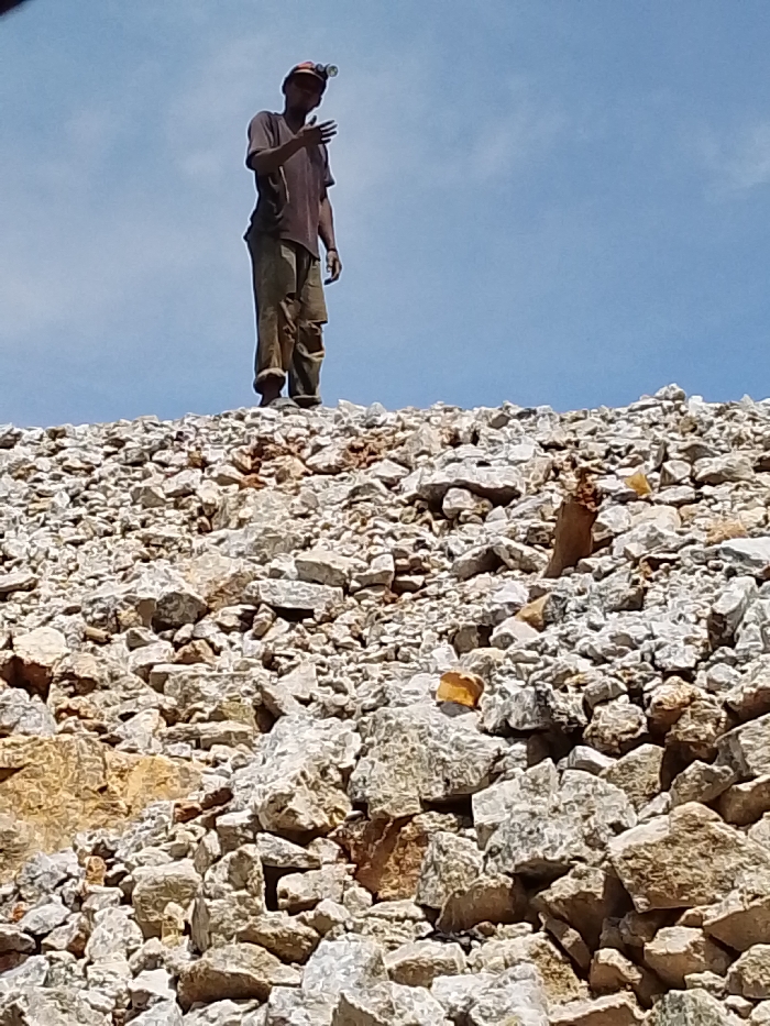 - "A man with a headlamp stands atop a large heap of rocks under a blue sky" by FM-kquCH2, licensed under CC BY 4.0