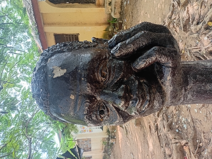 A weathered, dark-colored sculpture of a human head and partial torso stands centrally in an outdoor setting within Lokoja, Nigeria