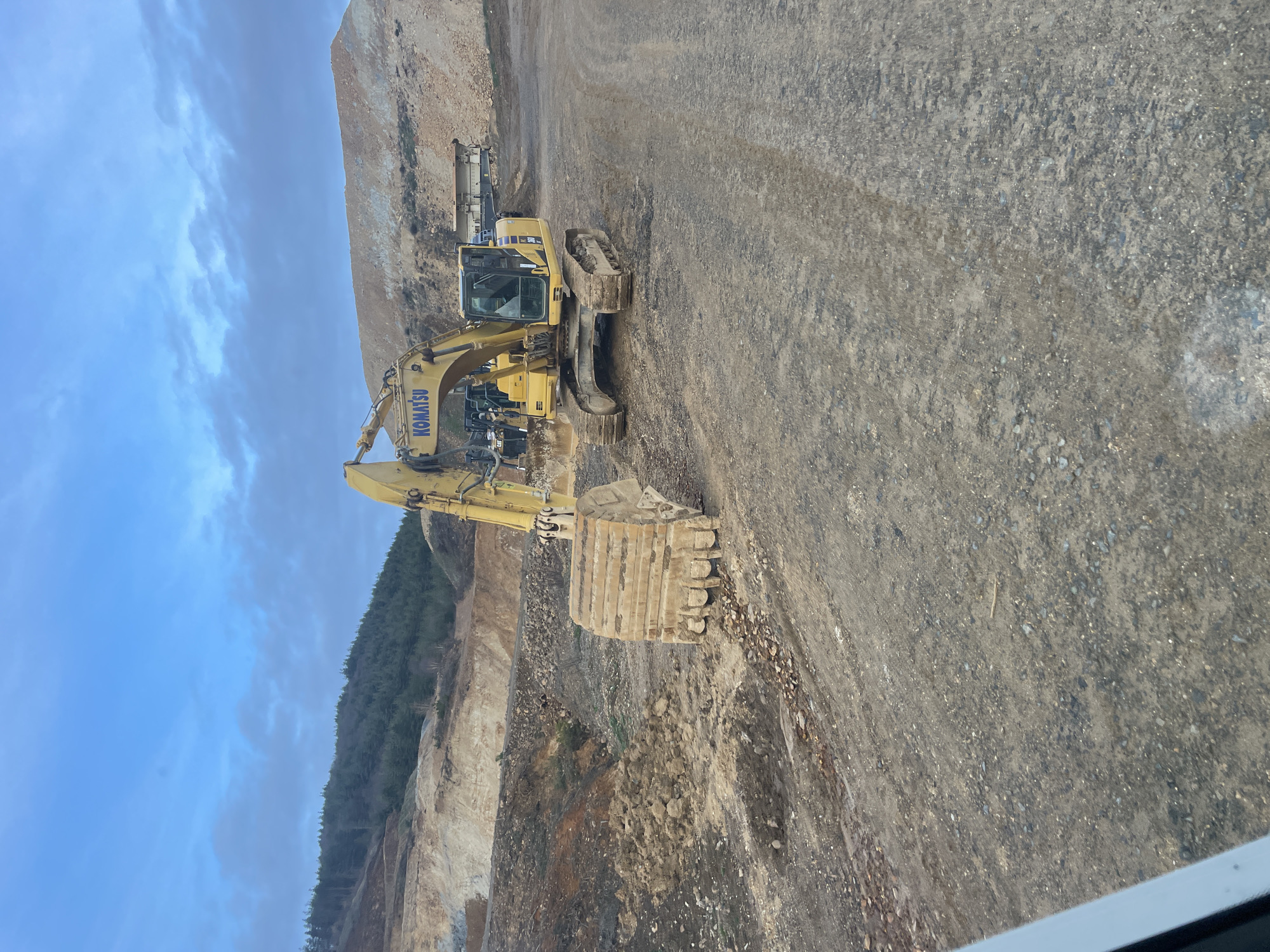 A yellow Komatsu excavator is parked on a dirt and gravel surface in Sedefche, Bulgaria