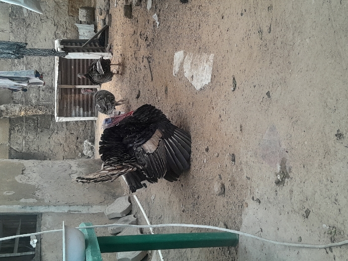 The image portrays an outdoor area in Hotoro South, Nigeria, characterized by dry, unpaved ground. In the foreground, a large adult male turkey, predominantly black with iridescent plumage, is centered, its tail partially fanned and wings slightly spread, facing away from the viewer. Its head displays red and blue wattles. To the immediate left, a light green plastic table holds a white plastic bowl. A white cable or rope lies on the ground, extending from the left edge towards the bottom center. In the midground, two smaller turkeys with speckled grey and black feathers stand on the dirt; one faces left, and the other faces away from the camera. In the background, a rudimentary shelter made from corrugated metal sheets and wooden supports is visible. Behind this structure, a portion of a fourth turkey can be discerned. The surrounding environment consists of weathered building walls: a light-colored, peeling wall with a dark window frame on the left, and a darker, textured stone or concrete block wall on the right. Several dark fabric items, possibly laundry, hang from a line in the upper background. The ground is uniform light-brown earth, scattered with small stones and minor debris.