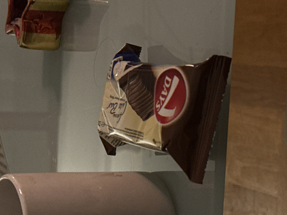 A 7 Days Bake Roll snack package is adhered to a light blue surface. The package is mostly brown and beige, with a red logo. The surface has a cylindrical object. To the upper left is a crumpled metallic wrapper, also attached to the light blue. A vertical wooden edge is visible to the right.