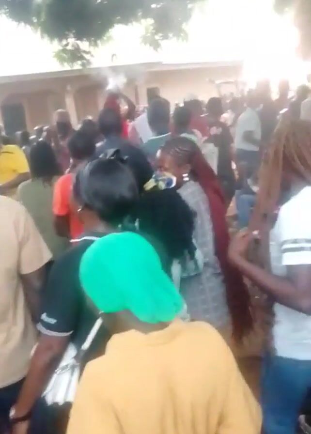 crowd of people, primarily viewed from behind, gathered outdoors in a shaded area beneath trees. The people are dressed in casual clothing. Some individuals are moving, contributing to the bustling atmosphere. A building is visible in the background. The overall lighting is bright, with some areas appearing overexposed. The camera appears to be held by a person within the crowd, contributing to the dynamic and somewhat unsteady view.