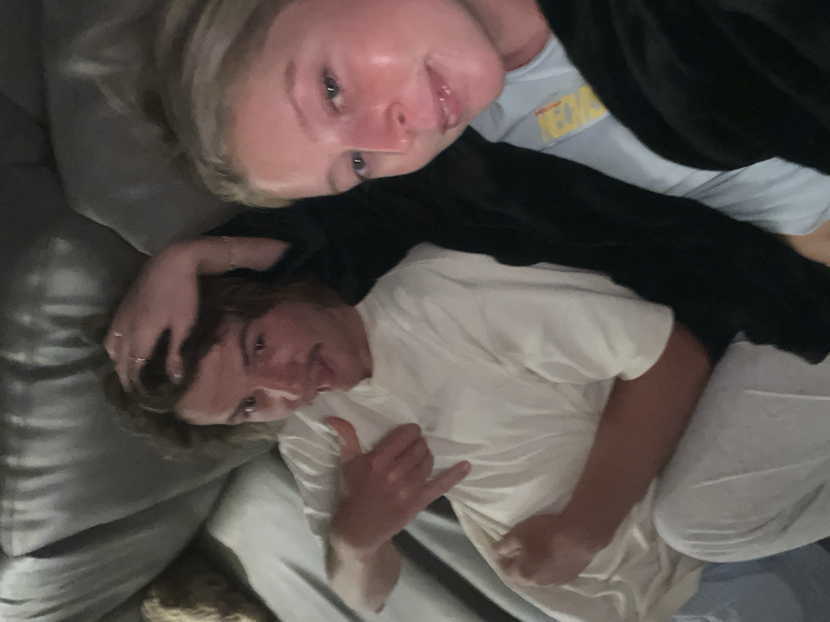 This image depicts two individuals, one male and one female, seated on a dark grey upholstered sofa in an indoor setting located in Bulli, Australia. The male, positioned on the left, has shoulder-length brown wavy hair and a thin mustache. He wears a light-colored t-shirt and light-colored pants. His right hand is extended in a "shaka" gesture, and his tongue is slightly extended. The female, positioned on the right and partially cropped, has blonde hair pulled back. She wears a light blue t-shirt with a graphic print and a dark-colored hooded jacket or blanket. Her right hand, adorned with rings, rests on the male's hair/head. Both individuals are looking towards the camera. A brown, indistinct object is partially visible in the upper left background. The scene is dimly lit.