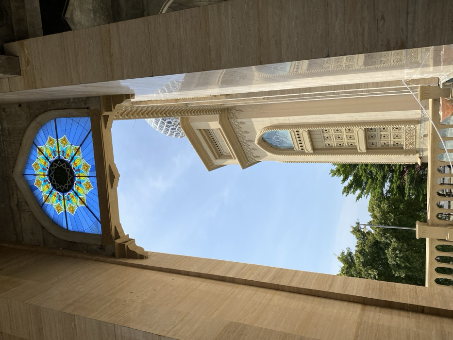 Looking up from beneath a travertine structure reveals a clear blue sky framed by ornate architecture. A stained-glass window with a blue and gold geometric pattern sits on the left. The right side shows the side of a building with arched windows, intricate carvings, and a latticed dome. Lush green trees stand beyond the building. The image is presented at an odd angle, adding to the unique architectural perspective.