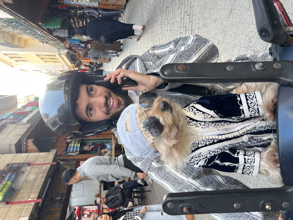 An image captured in a bustling street of Tanger, Morocco, depicts a young adult male on a scooter with a dog, engaged in a phone call, with various pedestrians and market stalls in the background. The primary subject, a male with a dark beard, wears a black motorcycle helmet and a grey and white patterned hooded garment. He is smiling and holds a black smartphone to his left ear. Positioned in front of him, on the scooter's handlebars, is a small, light-brown dog adorned in a light-blue baseball cap worn backward, aviator sunglasses, and a blue velvet garment with intricate white embroidery, styled similarly to a traditional Moroccan caftan or djellaba. The scooter's black and blue front structure is visible in the immediate foreground. The setting is a narrow, sunlit street, likely a market alley or souk within the city. To the left, a building features an upper balcony and a storefront with a partially visible sign reading "ARLY." Several individuals are present: a man in a grey sweatshirt stands with his back to the camera, a man in a black jacket sits at an outdoor table, and a young girl in a plaid top stands near the left edge. Colorful fabrics or banners are draped from upper levels. To the right, the street recedes into the distance, lined with buildings and market stalls displaying merchandise. Multiple pedestrians, some wearing traditional Moroccan attire like djellabas, are walking away from the camera. The street surface is paved with irregular stones. The overall scene is brightly lit by natural sunlight.