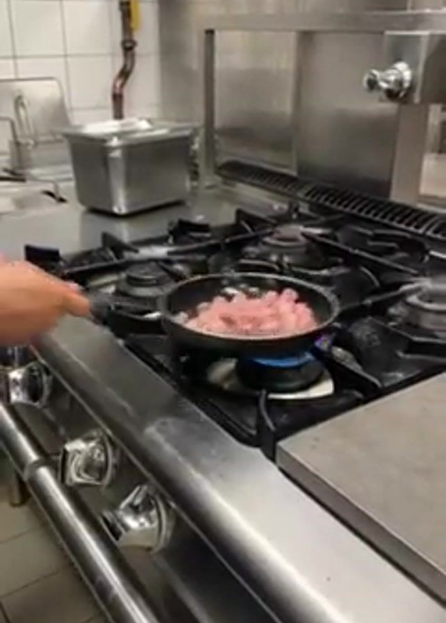 In a commercial kitchen, a person is cooking diced meat in a frying pan on a gas stove